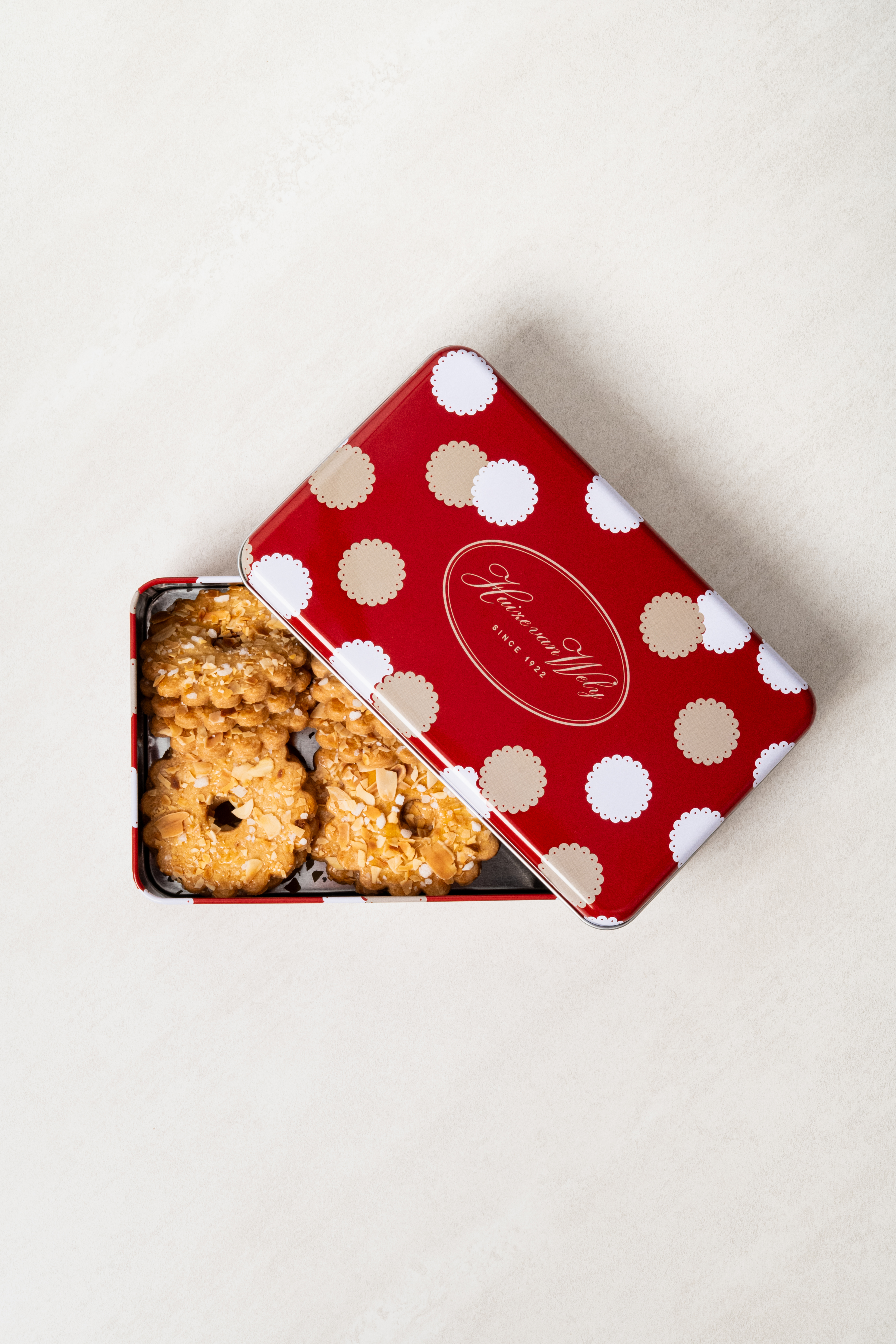 Huize van Wely-kerstblik, gevuld met roomboterkoekjes gegarneerd met amandelschaafsel en grove suiker (170g)