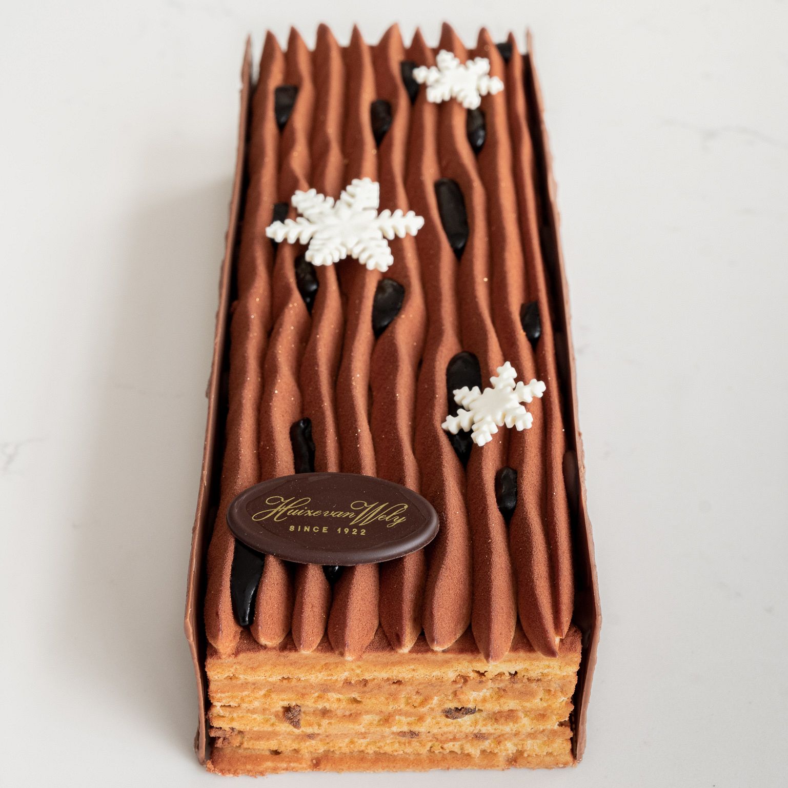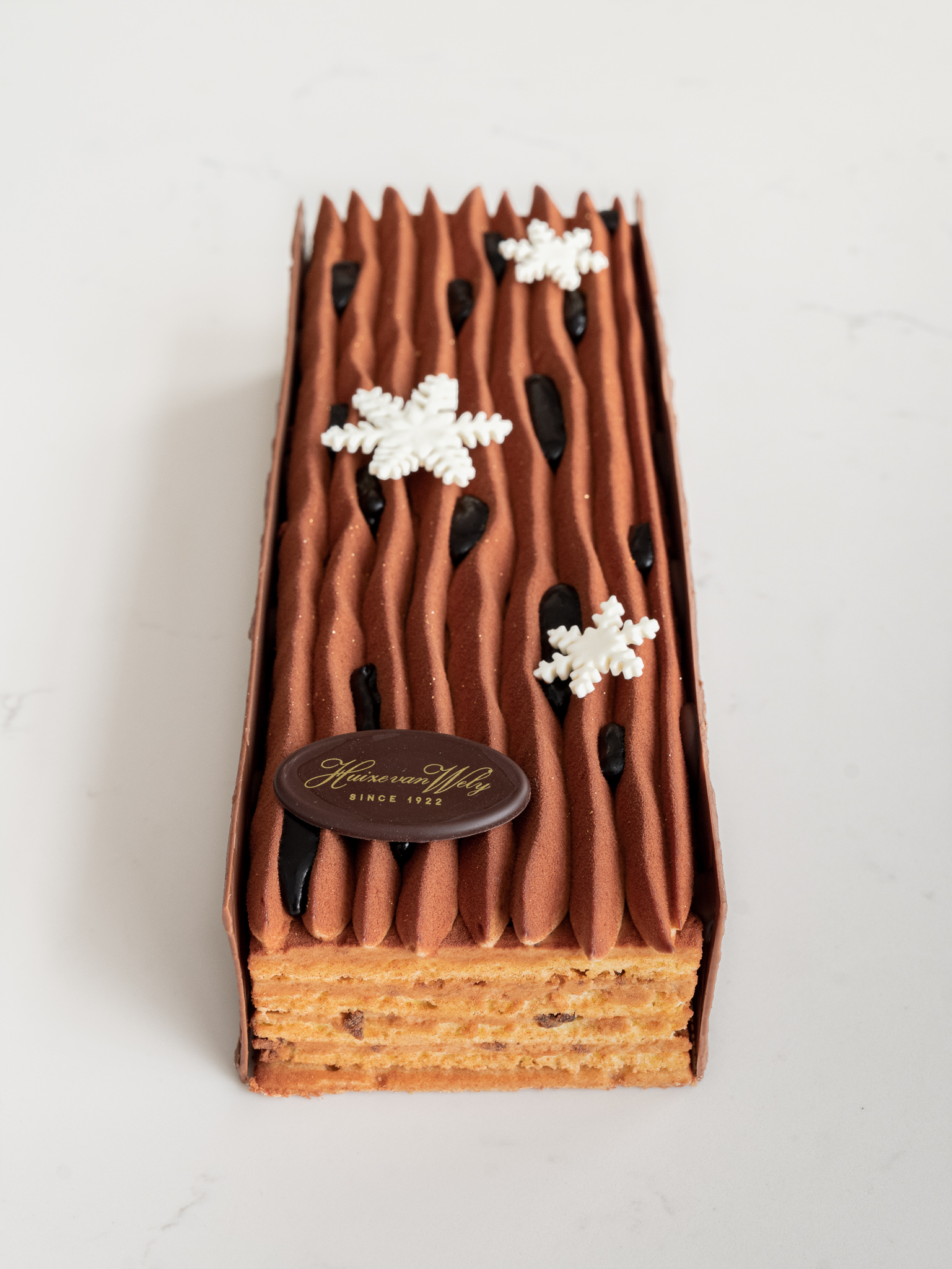 Crème au beurre van mokka met gianduja en rum-rozijnen, tussen laagjes chocolade- en amandelbiscuit, op een bodem van harde wener