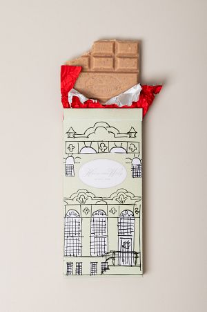 Witte chocolade op smaak gebracht metframbozen poeder en gevuld met nougat stukjesen gedroogde/gekonfijte vruchten/noten