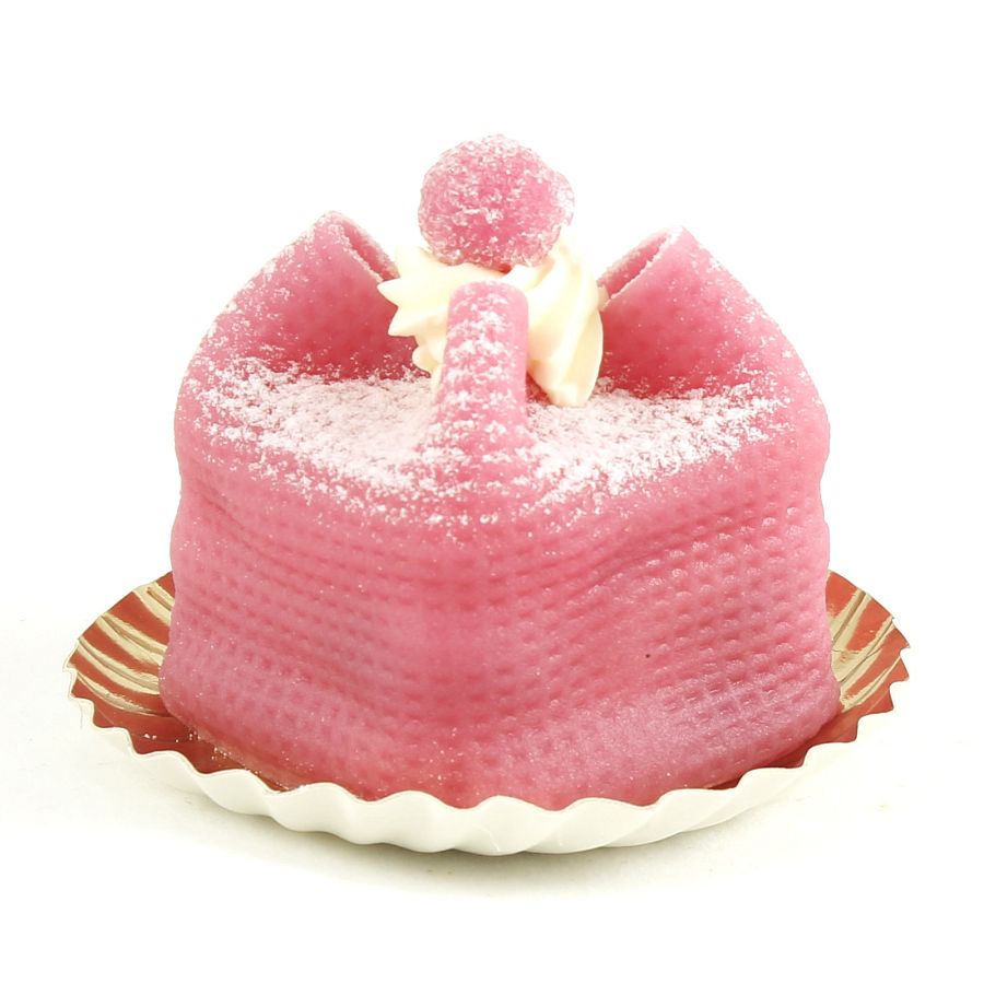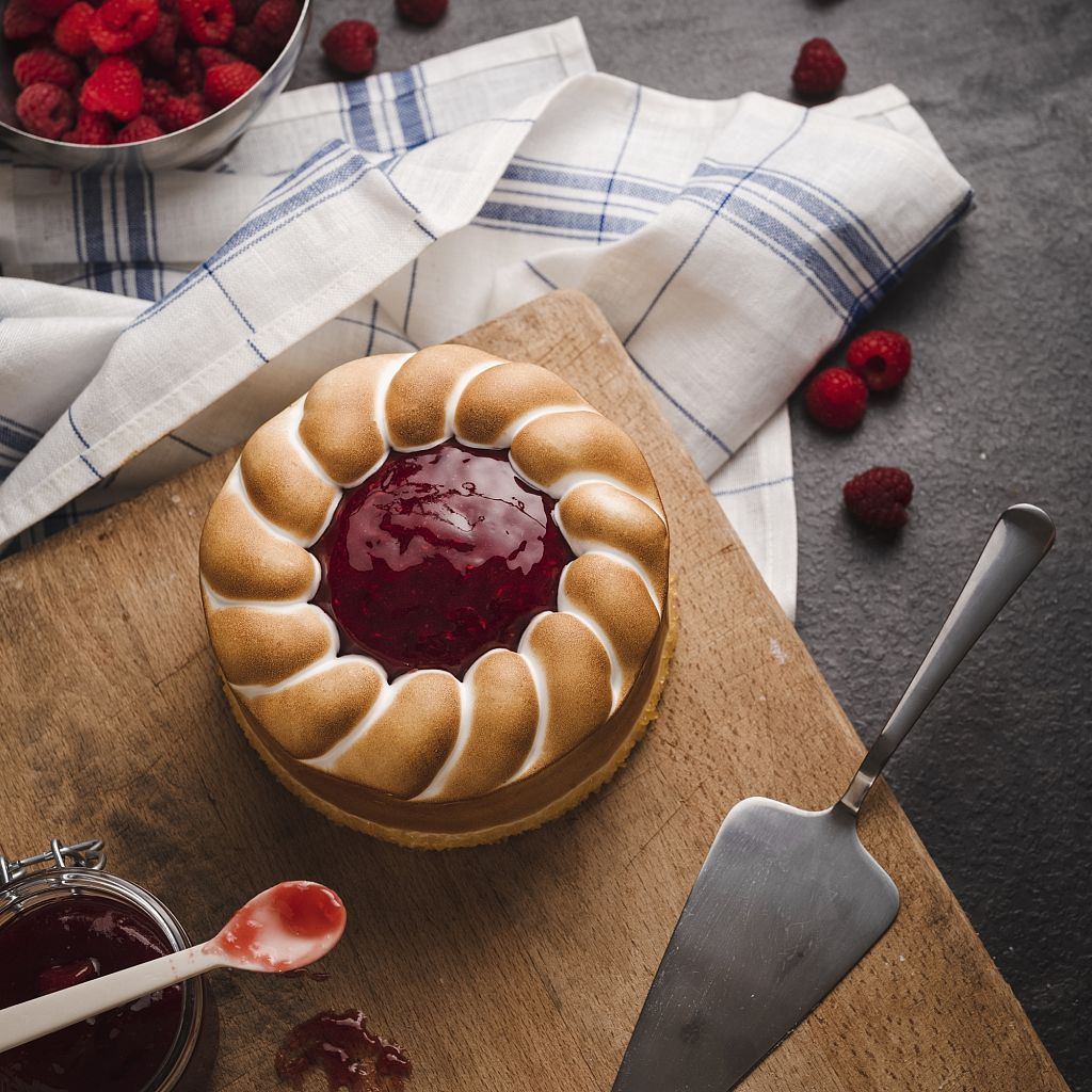 Moskovisch gebak met een mousse van umer en frambozen, afgewerkt met een glanzende frambozengelei