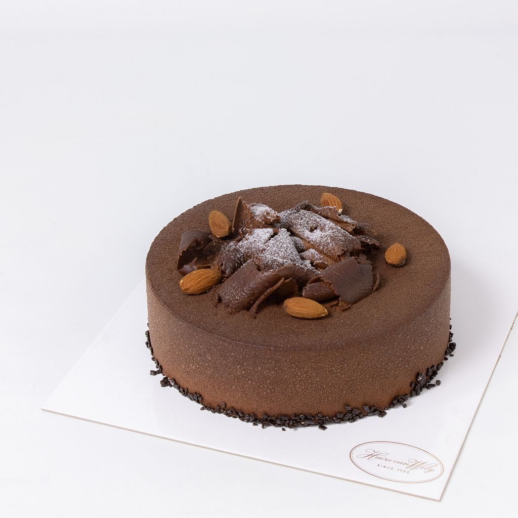 Moskovisch gebak met een vulling van pure chocolade crème au beurre, een crèmeux van pure chocolade, afgewerkt met ...
