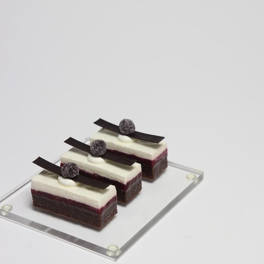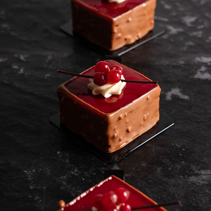 Amandelbiscuit met een laagje witte chocolade mousse, een laagje aalbessencrèmeux, afgedekt met een glanzende ...