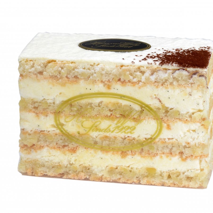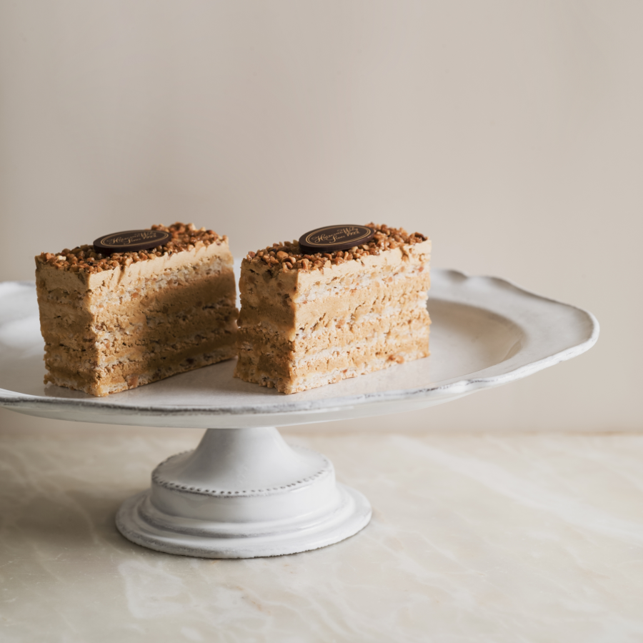 Laagjes tyrolienne van macadamia met mokka crème au beurre en afgewerkt met stukjes krokante hazelnoot
