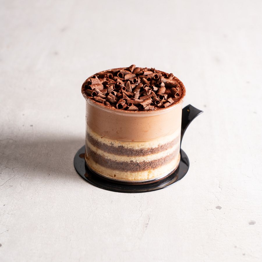 Chocolade gebakspunt bestaande uit een chocolade cremeux, laagjes chocolade biscuit, omhuld met een mousse van pure ...