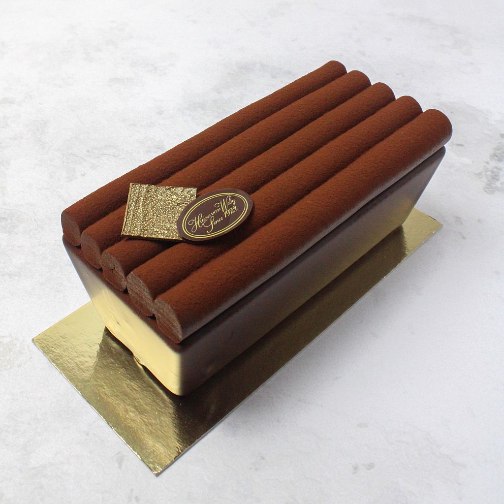 Pure chocoladecake met laagjes extra bittere mokka-chocoladeganache, omhuld met pure chocolade en be...