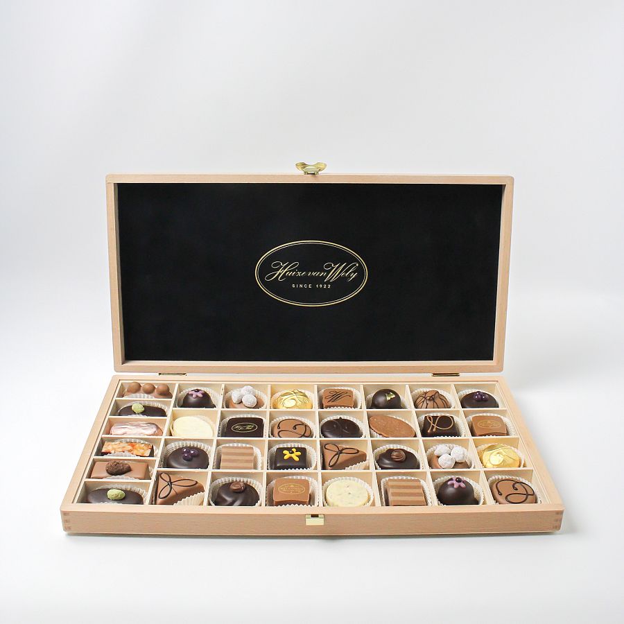 Beukenhouten geschenkkist bouchée assorti (34 stuks)