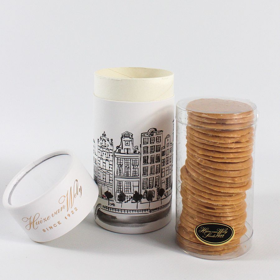 Origineel Huize van Wely kokertje met geïllustreerde Amsterdamse grachtenpanden, gevuld met chocoladegalettes in de ...