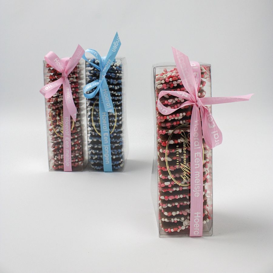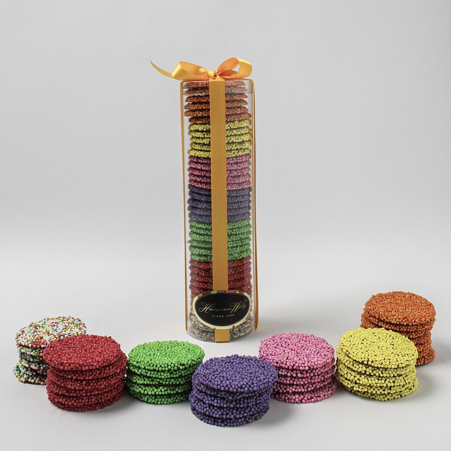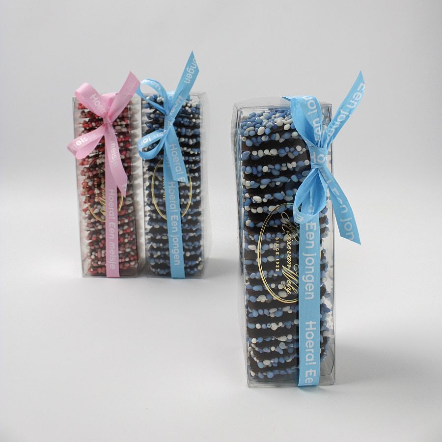 Pure chocolaatjes bestrooid met gesuikerde anijszaadjes in blauw