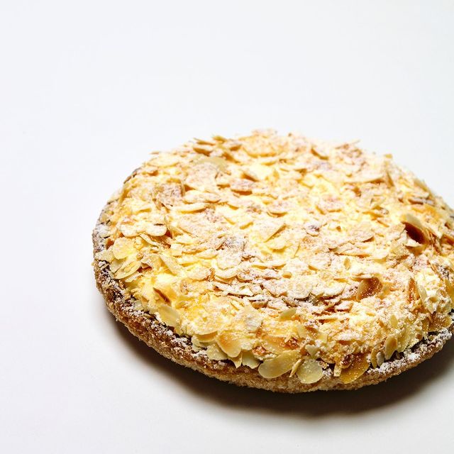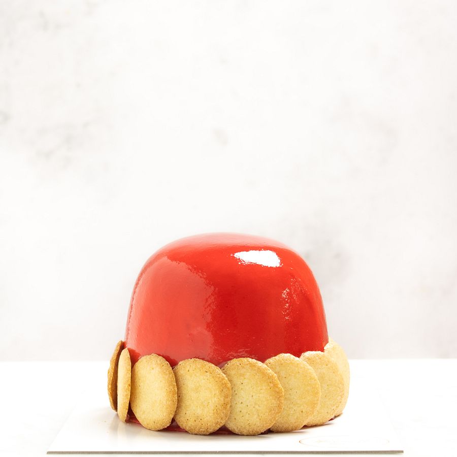 Interieur bestaande uit een frambozen en mangosorbet op een biscuitbodem