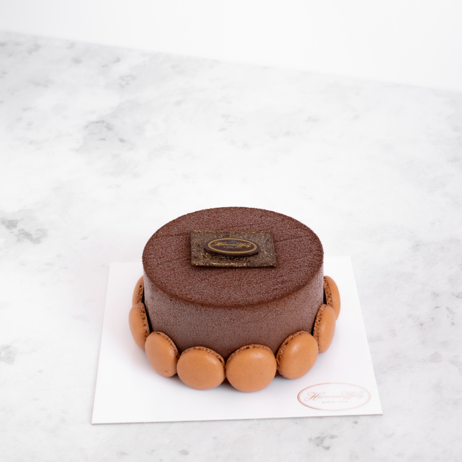 Interieur van witte chocolade en koffie roomijs, een biscuit van chocolade-amandel, fluweel afgespoten met pure ...