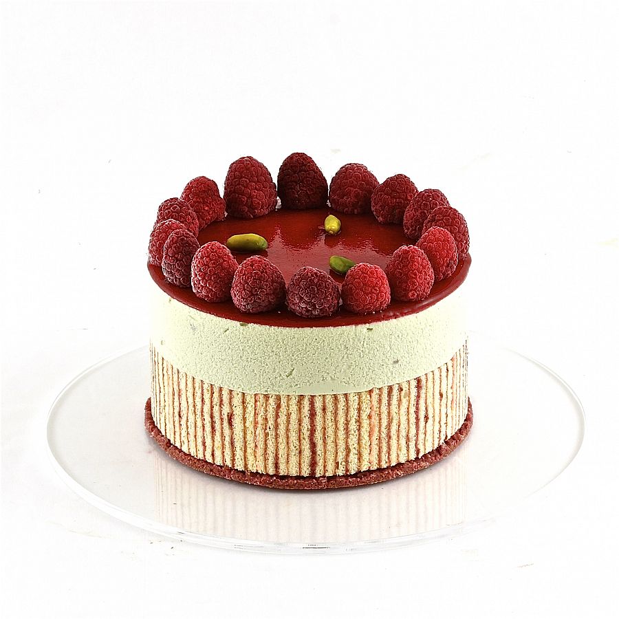 Sorbetijs van framboos met pistacheroomijs, vanilleroomijs, amandeltyrolienne en frambozenfeuilletine, gedecoreerd met ...