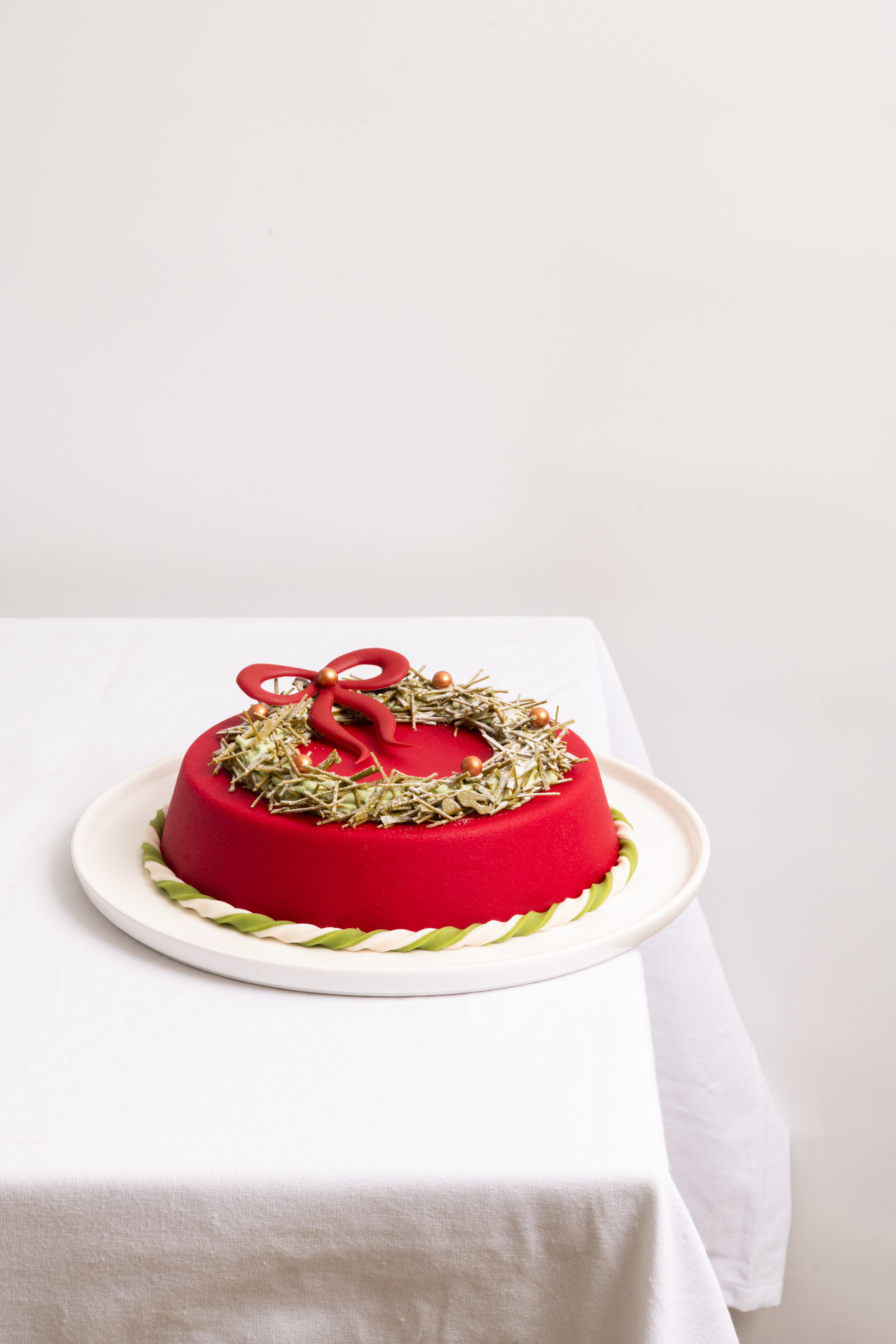 Taart van crème au beurre met stukjes perzik, bitterkoek en rumrozijnen gecombineerd met moskovisch beslag, gehuld in marsepein (18 cm - 8 personen)