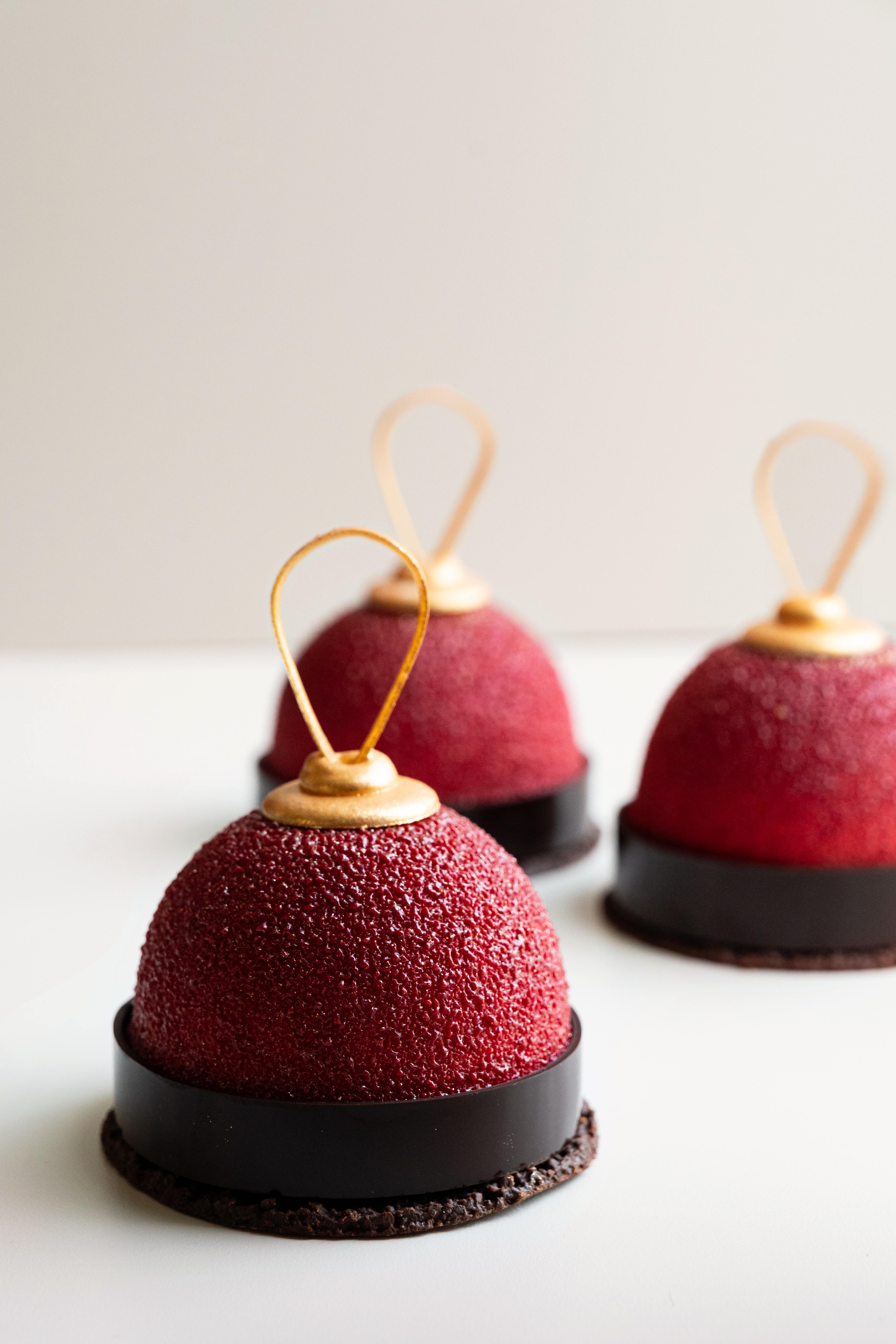 Een verfijnde creatie van hazelnotenmousse, kersencompote, pure chocolade en amandelbisquit op een pure feuilletinebodem.