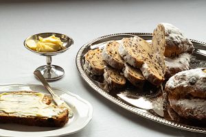 Stol met rozijnen, krenten, walnoten, gekonfijte sinassnippers, bigarreaux, sukade, specerijen en zachte amandelspijs, bestoven met poedersuiker (1000g)Ook verkrijgbaar in 500 gram