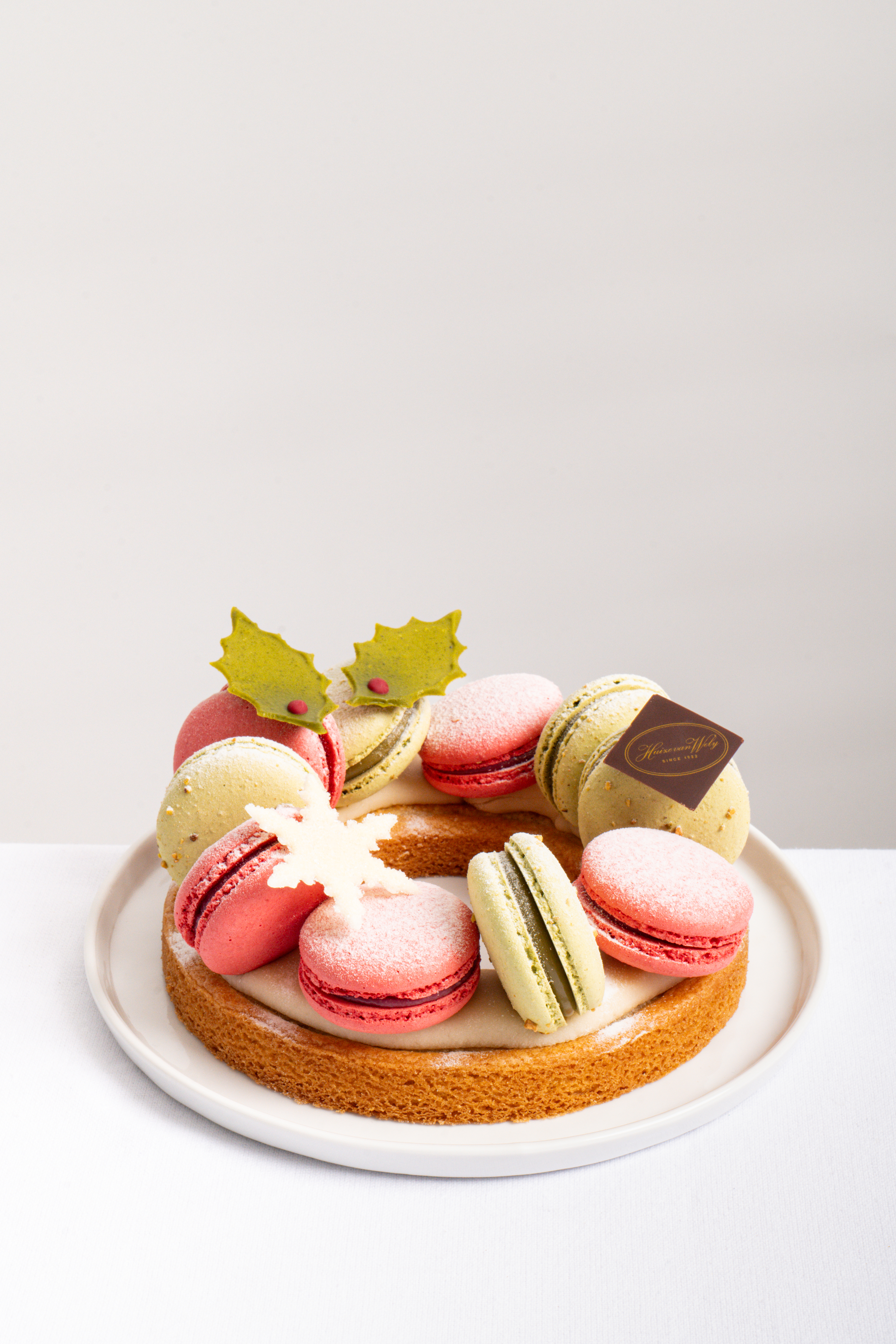 Luchtige roomboterkoek met amandelspijs enbanketbakkersroom, gecombineerd metvanilleganache, afgewerkt met macarons in desmaken pistache & framboos