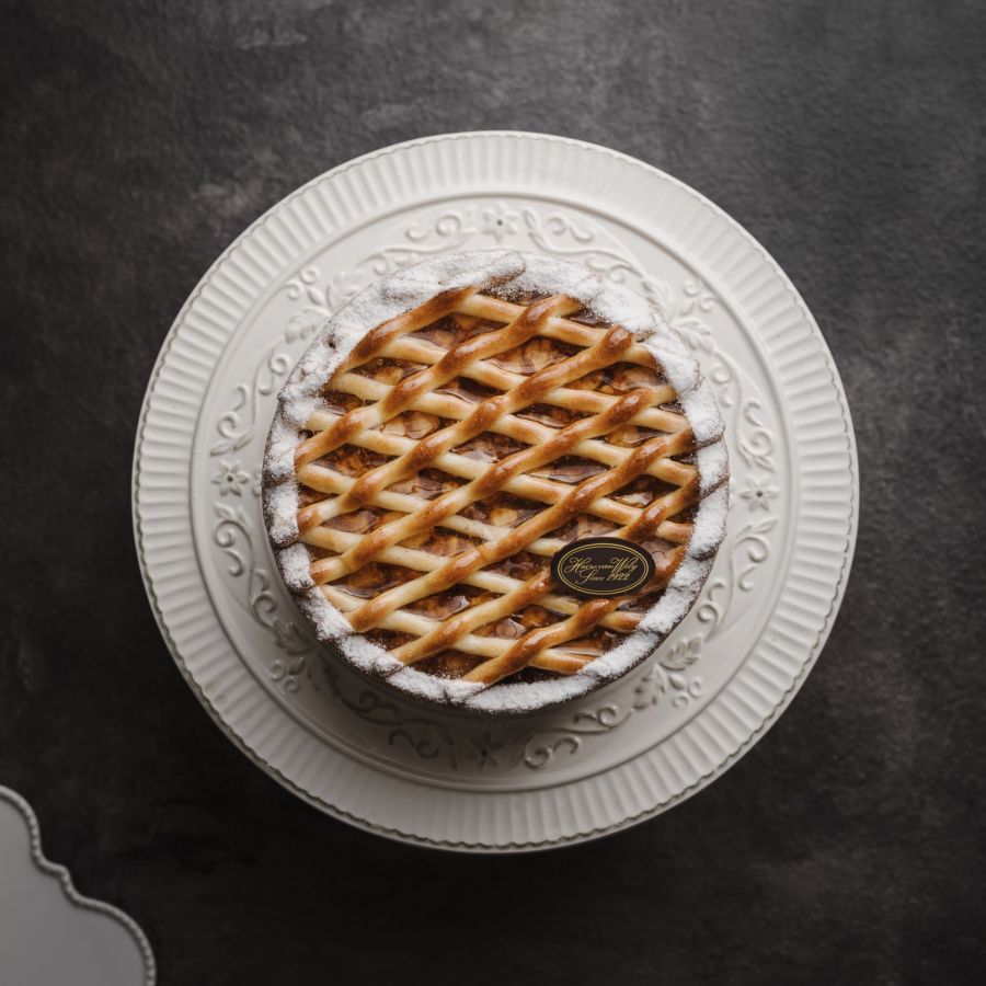 Bodem van roomboterdeeg met een laagje amandelspijs, amandelbeslag, een vulling van appel, gekonfijte sinaasappel, ...