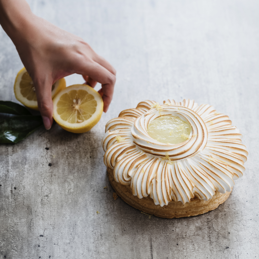 Bodem van roomboterbladerdeeg met een mousse van frisse kwark met lemon curd, afgewerkt met geflambeerde Italiaanse ...