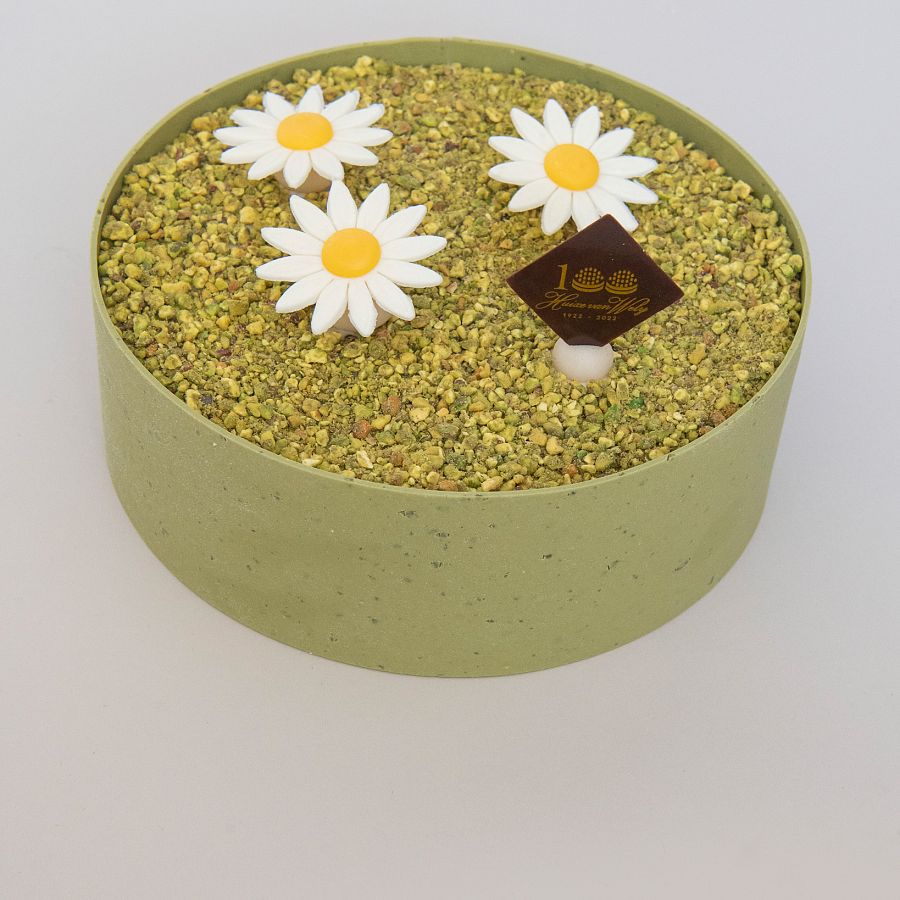 *special edition* interieur van pistache-anglaise en amandelbiscuit, omhuld met een mousse van vanille, op een bodem van...