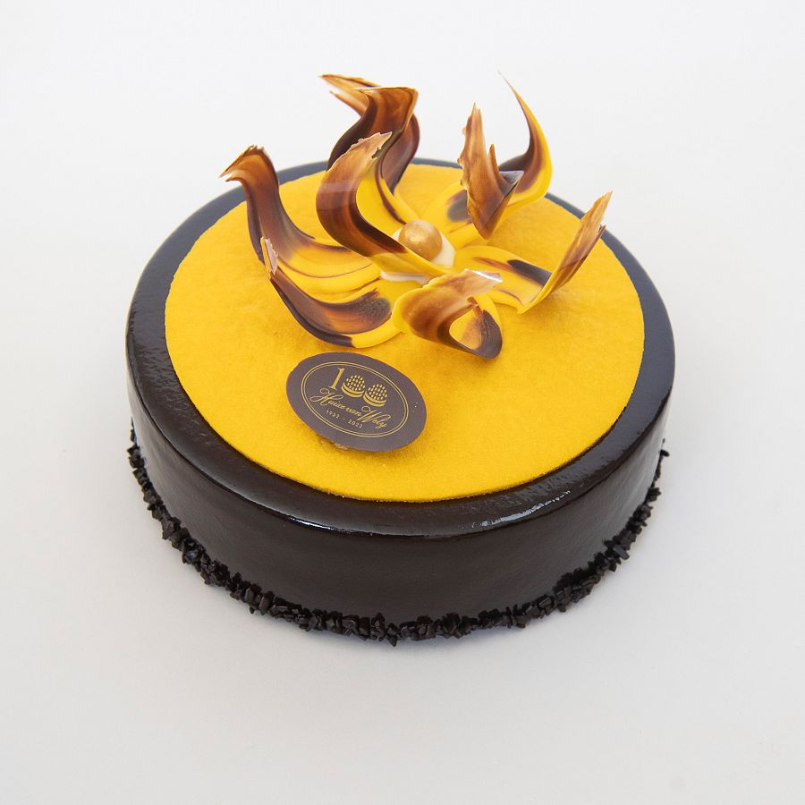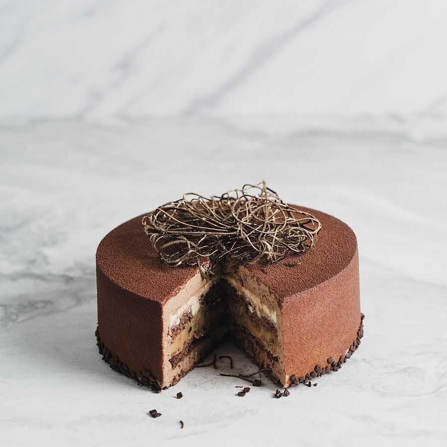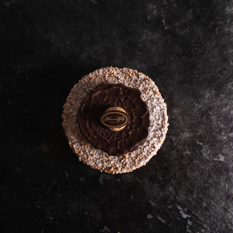 Bestaande uit een cremeux van pure chocolade en chocoladebeslag, op een bodem van harde wener, omhuld met luchtige ...