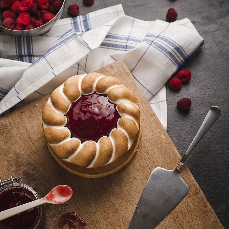 Moskovisch gebak met een mousse van frisse kwark, gedecoreerd met een compote van framboos en geflambeerde Italiaanse ...